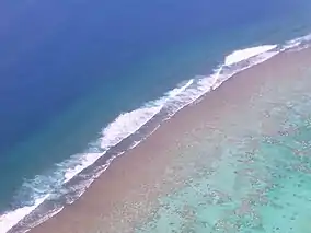 Aitutaki is sometimes described as an "almost atoll", for it consists of a lagoon within an encircling atoll, with a significant area of high land on one side. It has a maximum elevation of approximately 123 metres (404 ft) with the hill known as Maunga Pu close to its northernmost point. The land area of the atoll is 18.05 km2 (6.97 sq mi), of which the main island occupies 16.8 km2 (6.5 sq mi).[3] The Ootu Peninsula, protruding east from the main island in a southerly direction along the eastern rim of the reef, takes up 1.75 km2 (0.68 sq mi) out of the main island.[4] For the lagoon, area figures between 50 and 74 km2 (19 and 29 sq mi) are found.[5][6] Satellite image measurement suggests that the larger figure also includes the reef flat, which is commonly not considered part of a lagoon.[7]