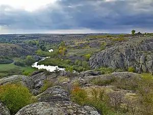 Aktove Canyon consists of ancient weathered granite, cut by Mertvovid river on the depth of more than 50 meters. Area of the canyon outreaches 250 hectares. Being a unique complex of granite rocks, boulders and water/steppe ecosystems, canyon is located on one of the oldest parts of Eurasian land.[3]