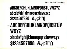 While apparently not unpopular, Akzidenz-Grotesk was not among the most intensively-marketed typefaces of the period, and was not even particularly aggressively marketed by Berthold.[14] A 1921 Berthold specimen and company history described it almost apologetically: "In 1898 Accidenz-Grotesk was created, which has earned a laurel wreath of fame for itself. This old typeface, which these days one would perhaps make in a more modern style, has a peculiar life in its own way which would probably be lost if it were to be altered. All the many imitations of Accidenz-Grotesk have not matched its character."[36] An unusual user of Berthold's Akzidenz-Grotesk in the period soon after its release, however, was the poet Stefan George.[57] He commissioned some custom uncial-style alternate characters to print his poetry.[58][59][60]