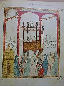 Image of a Jewish cantor reading the Passover story in al-Andalus, from a 14th-century Spanish Haggadah