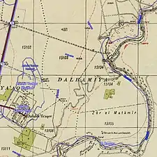 In 1875 Victor Guérin noted that the houses of the village were built of adobe, and most were surmounted by reed huts.[5] The same year C. R. Conder called it a "miserable" adobe hamlet.[6][7] A population list from about 1887 showed ed Delhamiyeh wa ’Arab el Hanady to have about 650 inhabitants; all Muslims.[8]