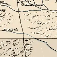In 1992 it was described: "The only remaining landmarks is a cemetery on Tall Abu al-Faraj (199/203), north of the site. To the north and the west of this tell are the springs of 'Uyun Umm al-Faraj and 'Ayn al-Khanazir. Most of the village site and the land around it are covered with palm trees."[5]