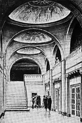 The inner lobby is double-height and rectangular in plan, with a staircase to the mezzanine at the southeast end.[27] It was originally decorated in cream-colored plaster.[21] The northern wall (leading from the ticket lobby) is decorated with a molded panel. Above that is a large arch, which encompasses three smaller arched openings with geometric glass panes.[28] The inner lobby contains piers on the west and east walls, with attached wrought-iron lighting sconces.[21][29] These piers support three round arches on each side; a mezzanine-level lounge is behind the western arches.[26] At ground level, the western wall contains modillions and pilasters, topped by capitals containing stylized-leaf and volute motifs.[29] There are also leaded-glass double doors in the two outermost arches, which lead to the auditorium.[30] At mezzanine level, both walls contain paneled railings with molded bands of dentils and bosses.[29] Three circular ceiling domes rise from the wall arches.[22][26] One contemporary source described the domes as depicting "figures in mediaeval costumes against a gold ground".[21]