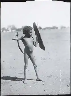 ![]() An Arrernte boy practicing with a toy shield and boomerang at Alberga Creek, 1920. (Source: National Museum of Australia) | |