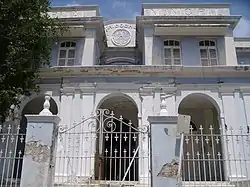 The oldest records found indicate that the structure was built in 1885 consisting of a one-story building organized around two identical anterior courtyards. This original spatial distribution is still preserved today. The southern half was altered in 1928 after the 1918 earthquake damaged part of this side. During this remodeling a second story was added to this half. This southern facade is set back from the street by a fence and front yard. Its main element is the entrance portico articulated by flat tuscan pilasters and three arches, the central one slightly protruding to the front (This portico is part of the original 1885 construction). Over the portico, separated by cornice and parapet with the building's name in sans serif letters. Other decorative elements at this level include overhangs, a segmental round cornice over the recessed center window, louvered casement windows with segmental round openings and plain glass transoms and a rosette on top of the center recess between the two volumes. In contrast, the first floor of this south facade presents large rectangular windows with wide planar moldings and a simple cornice with a segmental pyramidal profile on the top molding, a cornice and rectangular windows with false segmental arch crowned by an equally false keystone all part of the original 1885 construction.[16]