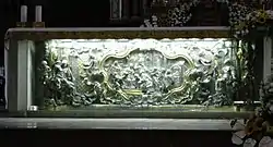 The Whitefriar Street Carmelite Church in Dublin contains some of his relics. His liturgical feast sees a relic of the saint dipped into the water of Saint Albert's Well (in Agrigento) and the Carmelites say that those who piously use the water receive healing of mind and body, through the intercession of Albert.[3] His flask that contained wormwood is in Corleone and the stone he used as his pillow is in Petralia Soprana. His skull is contained in a silver statue crafted in the 1700s (the engraver Vincenzo Bonaiuto did this) for the saint's altar in the Trapani Marian basilica after being moved from Messina. Teresa of Ávila and Maria Maddalena de' Pazzi had strong devotions to him. Battista Spagnoli composed a Sapphic ode in his honor and a gate in Messina was named after him in 1623.[1] Vincenzo Barbaro and Theodore de Aquis were just two of some who wrote biographies on the late saint.[3]