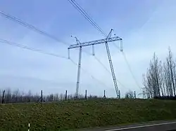 Portal pylons are used as suspension pylons. These are free-standing structures in areas, which are sometimes flooded and guyed ones in areas without flood-danger. As anchor pylons towers with one crossbar are used whereby the conductor is led around the pylon structure. The powerline was designed for the transmission of 2,000 MW electricity.[2]
