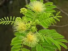 Albizia amara is a mid-sized, deciduous tree which resembles acacia without the thorns.[3] The bark of the tree is grey in color and is grainy and scaly.[3] The leaves consist of up to 15 pairs of side stalks and the leaflets are tiny and can consist of about 15–35 pairs.[3] The flowers are whitish-yellow powder puffs with long stamens and golden pollen.[3] The pods are flat and are about 20 cm long.[3] The leaves thin out during February–March and are renewed in April.[3] The flowers are present throughout May and the fruits ripen during October and November.[3] It is a host plant for Achaea janata.[4]