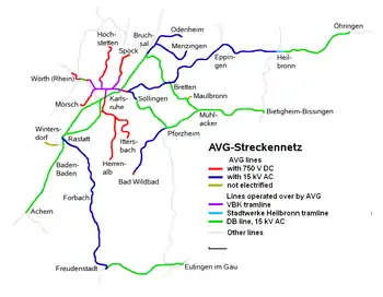 AVG dates back to the acquisition in 1958 of the Albtalbahn railway by the city of Karlsruhe. This 1,000 mm (3 ft 3+3⁄8 in) metre gauge electric railway was converted to 1,435 mm (4 ft 8+1⁄2 in) standard gauge and connected to the city's tram network. Because it remained legally a railway and needed to conform to mainline railway design and safety standards, AVG accumulated experience in operating across the divide between tramway and railway. It was this experience that led to the development of the Stadtbahn Karlsruhe and to the AVG operating over a much wider area.[2][3]