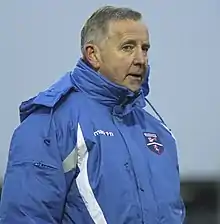 In January 2011 Kevin Dillon and assistant Gary Owers had left the club by mutual agreement, with the club lying 20th in League Two, after winning just 6 out of 22 league games.[14] Dillon was replaced by Newport County manager Dean Holdsworth.[15] Holdsworth succeeded in removing the threat of relegation, eventually guiding the club to 14th position in a run which included only 4 defeats in the second half of the season. Aldershot finished 11th in the 2011–12. A good run in the League Cup saw Aldershot take on Manchester United at home, which ended in a 3–0 victory for the Red Devils. Holdsworth was sacked by Aldershot on 20 February 2013 with the team in 20th place in League Two.[16]