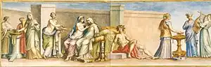 The so-called Aldobrandini Wedding (Nozze Aldobrandini) fresco is an influential Ancient Roman painting, of the second half of the 1st century BC, on display in the Vatican Museum. It depicts a wedding along with several mythological figures.