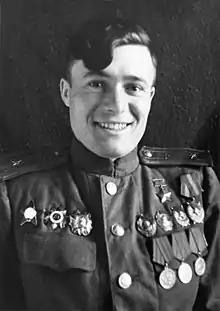 He was promoted to the position deputy commander of flight training in November 1944. During a flight over Latvia on 26 January 1945 he was seriously wounded when he was hit by a piece of an anti-aircraft shell. He fainted almost immediately after landing. Two days later he was nominated for the title Hero of the Soviet Union a second time for flying 509 sorties, personally shooting down 31 enemy aircraft, and gaining 12 shared kills;[3] he received the title after the end of the war on 18 August 1945. He flew only two more missions after recovering before the war ended.[4][5][6]