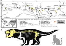 Fossil vertebrates in the Omingonde Formation of Namibia were first found and published by Keyser in 1973. Among the fossils he described amphibians, cynodonts and dicynodonts. The cynodonts were initially represented by Cynognathus and herbivorous gomphodonts. After the discovery of Aleodon among other cynodont specimens such as Chiniquodon, Luangwa, and an unidentified traversodontid in 2009, the Omingonde Formation of Namibia is considered to possess the most diverse fauna of Middle Triassic cynodonts in the world. The discovery also provided researchers a definite link between two faunas in South America and East Africa.[8] From this, the Omingonde formation was also considered the key in “reconstructing the biogeography of Southern Gondwana during the Middle Triassic”.[8]