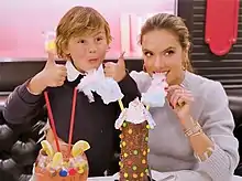 By 2006, Ambrosio was selected as the first spokesmodel for the Victoria's Secret "PINK" line.[1] In 2005, she walked the Victoria's Secret Fashion Show runway wearing lingerie made entirely out of candy.[38] In the 2008 edition of the Fashion Show, she walked the runway three months after giving birth to her first child,[39] and opened the show the following year in 2009. The 2011 show saw her wearing the heaviest wings (30 lb, 14 kg) ever made for the show while pregnant with her second child.[40][41]