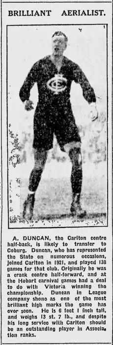 According to The Argus, "Duncan his played many fine games for Carlton, and has also been a tower of strength in interstate teams, but he has never been seen to better advantage. His marking was superb, his judgment faultless, and his kicking splendid, while his dash turned many attacks."[11]