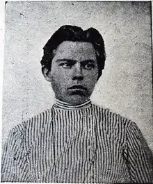 It is unknown exactly when Antonov became involved in radical politics.[2] At some point he joined the Socialist Revolutionary Party. He first appears on police records as a known revolutionary in 1908, when he travelled to Tambov to establish connections between his group and the Tambov Socialist Revolutionaries.[3] Antonov became an "expropriator", someone who carried out robberies to support the revolutionary cause (called "expropriations" by revolutionaries). Antonov is associated with the robbery of a railway station in Inzhavino, where a note was left stating the exact amount taken "by the party of anarchists-individualists", signed by "a member of the party".[4] He was also involved in the robbery of a bank in Kaninskii, where the amount taken was entered into the accounts book as being confiscated by "the Volga Union of Independent Socialist-Revolutionaries".[4]
