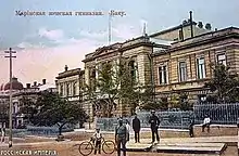 After that, the imperial family went to the women's gymnasium of the St. Nina, where they were met by the Vice-Governor I. A. Benislavsky. The Empress was greeted with a speech by the student Yakubovskaya who graduated from the course that year. Along with the School of the St. Nina's students, the pupils of the orphanage of the local charitable society also brought gifts to the imperial couple. Afterwards, the Emperor and his family proceeded to the courtyard of the institution, where the students of the city schools were gathered.[5]