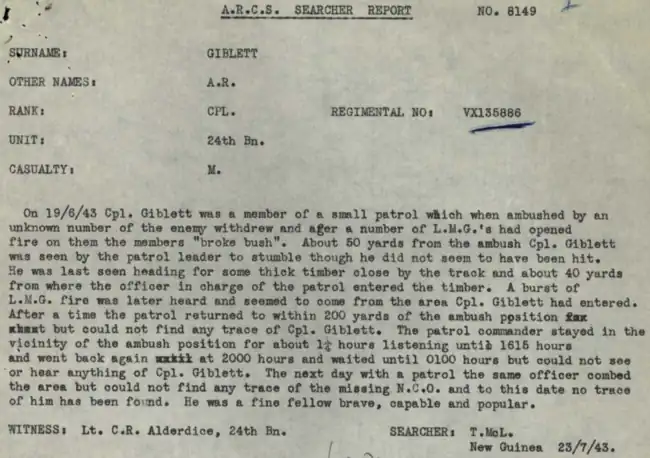 - Roll of Honour: Corporal Alfred Rowton Giblett (VX135886), Australian War Memorial.