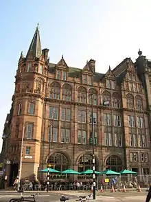 Waterhouse continued to practice in Manchester for 11 years, until moving his practice to London in 1865. At this stage of his career most of his commissions were either in the north-west or north-east of England. His earliest commissions were mainly for domestic buildings. Among Waterhouse's first commissions in 1854 were for his family: a set of stables at Sneyd Park, for his father, who had moved to Bristol, and alterations to the home of his uncle Roger Waterhouse at Mossley Bank in Liverpool.[11] In executing the commission for the cemetery buildings at Warrington Road, Ince in Makerfield (1855–56), he began his move towards designing public buildings in his developing Neo-Gothic style, building a lodge for the registrar, and two chapels, one Church of England in Gothic style, and one for Roman Catholic and Non-conformists in Norman style.[12] His first commission for a commercial building was for the now demolished Binyon & Fryer warehouse and sugar refinery in Chester Street, Manchester (1855). The building was of two floors made of brick with stone dressings and Italianate in style. The intended upper floors based on the Doge's Palace remained unbuilt.[13] Also he designed the Droylesden Institute (1858, demolished) in the Manchester suburb of Droylsden. It contained a reading room and other educational facilities and had some Gothic details. A similar building was the Bingley Mechanics' Institute built (1862–65), located in Bingley, with a hall and reading room in a Gothic style.[14]
