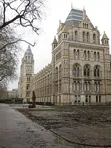 In addition to the collection at the RIBA, the Natural History Museum holds a significant quantity of drawings by Waterhouse relating to the design of the terracotta sculpture on the building. The 136 pages of drawings are bound together in two volumes and cover the period 1874 to 1878.[54] The subject matter is not just flora, insects, fish, lizards, snakes and animals, some of extinct species, but ornament as well.[55] Extinct species decorated the eastern side of the building internally and externally, living species likewise decorated the western half of the building as well as the North Hall and Main Hall. [56] The designs are for the sculpture on the top of the facade, gargoyles, column capitals, friezes, relief panels, lunettes, spandrels and other architectural features of the building, both external and internal. These drawings would be turned into the finished terracotta by Gibbs and Canning, who employed Brindley and Farmer and their employee a Frenchman M. Dujardin to do so.[57]