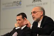 On 13 December 2010, Ahmadinejad dismissed Manouchehr Mottaki for unknown reasons and appointed Salehi in an acting capacity.[14] On 23 January 2011, Ahmadinejad nominated Salehi to become foreign minister. The Iranian Parliament voted him on 30 January and he became the foreign minister of Iran, gaining 146 positive votes.[15] The European Union and the Treasury of the United Kingdom had put Salehi into the sanction list as an asset freeze target on 18 November 2009 due to his previous involvement in Iran's nuclear programme.[16] The EU waived this designation when he became foreign minister in 2010.[17] His term as foreign minister ended on 15 August 2013 when Mohammad Javad Zarif took the position in the elected President Hassan Rouhani's government.[18] A day after, Rouhani appointed Salehi as head of Atomic Energy Organization for a second time on 16 August 2013.[8][18] Salehi replaced Fereydoon Abbasi in the post.[19]
