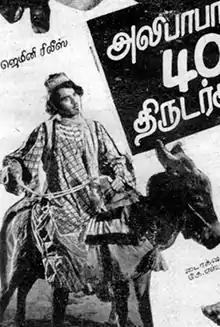 Alibabavum 40 Thirudargalum was the first Tamil adaptation of the story Ali Baba and the Forty Thieves.[2] It was directed by K. S. Mani for the company Pakshiraja Films that was owned and operated by S. M. Sriramulu Naidu. N. S. Krishnan was cast as Ali Baba, and his wife T. A. Mathuram as the slave girl Morgiana. Thoothukudi Ramaswamy Aiyer portrayed a character named "Pulimoottai", which subsequently became his prefix. Shooting took place at Central Studios.[3]