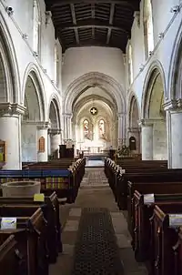 On the exterior, the south door and arch, west doorway, blocked north aisle window and string course are all Norman.[3] The Romanesque arches of the nave were constructed on the foundation of the earlier Norman church, with the Transitional chancel being added at the end of the 12th century,[7] probably being started around 1170, and the whole church being completed by the end of the century.[4] The chancel has a quadripartite ribbed vault, with modern plaster between the ribs. The central boss is of the Lamb of God.[5] There was a central tower,[4] which was removed in 1659, the thrusting out of the responds between choir and nave being visible today, as are distortion in the vault ribs of the chancel.[4]