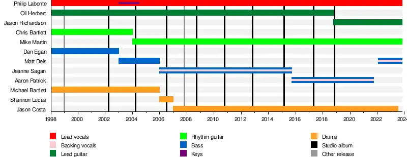 All That Remains is an American metalcore band from Springfield, Massachusetts, formed in 1998.[1] They have released nine studio albums, a live CD and DVD, and have sold over a million records worldwide. The group currently consists of vocalist Philip Labonte, rhythm guitarist Mike Martin, and lead guitarist Jason Richardson, with Labonte being the last remaining original member. In spite of this, the band's line-up had remained consistent from the release of 2008's Overcome until 2015's The Order of Things, spanning four albums. This line-up changed, however, in September 2015, when long-time bassist Jeanne Sagan left the band, with Patrick taking her place, and then again in February 2019, when the band confirmed that Jason Richardson would be joining the band to replace the deceased lead guitarist and original member, Oli Herbert. In 2021, Aaron Patrick parted ways with All That Remains to focus on his other band, Bury Your Dead.