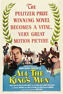 All the King's Men is a 1949 American drama written, produced, and directed by Robert Rossen. It is based on the Robert Penn Warren's 1946 novel of the same name. The film stars Broderick Crawford, John Ireland, Mercedes McCambridge, and Joanne Dru. The plot focuses on the rise and fall of the ambitious and ruthless politician Willie Stark (Crawford) in the American South.[2] Though a fictional character, Stark strongly resembles Louisiana governor Huey Long.[3]