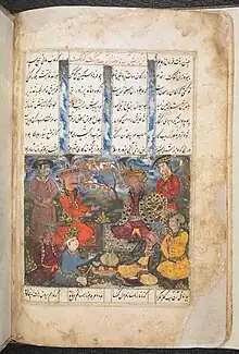 ![]() Allahverdi Khan (seated center right) with his son Emamqoli Khan (seated center left). From a Jarunnameh of Qadri. Isfahan style, dated 1697 | |