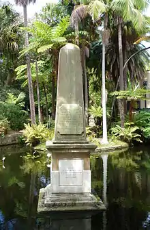 In 1831, Cunningham returned to England, but went back to Australia in 1837 on board Norfolk as government botanist, resigning the following year on finding that he was required to grow vegetables for government officials. On 27 June 1839, he died of consumption in Sydney, and was buried in the Devonshire Street Cemetery. In 1901, his remains were "reverently removed" and re-interred in an obelisk within the Royal Botanic Garden in Sydney.[15]