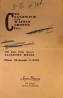 The Cox Sandwich & Waffle Shoppe Inc. was one of the many businesses operating in the hotel Circa 1930s. The proprietor, William Lea Cox, was born in Louisiana on July 3, 1891. He moved to New York after 1910. He married Caroline “Carrie” Unkel in 1913. He died June 21, 1939.