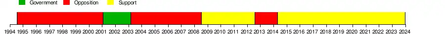 | Year | Leader | Popular vote | % of popular vote | # | # of seats | Seat change | Coalition | Status |