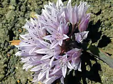 This small onion plant grows from a reddish-brown bulb 1 or 2 cm (1⁄3 or 2⁄3 in) long. It produces a short stem no more than 8 cm (3 in) long and two sickle-shaped leaves which are usually longer. The inflorescence contains up to about 35 flowers, each with dark-veined pink tepals around 1 cm (1⁄3 in) long and sometimes toothed at the tips.[4][5][6]