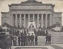 Despite expectations that the statue might be completed in time for the university's 1902 commencement ceremony, delays in French's work (in part due to critiques from Augustus Saint-Gaudens, but largely due to strikes at the Jno. Williams, Inc. foundry) postponed the unveiling until September 23, 1903, the first day of classes for the 1903–1904 school year.[10] At the ceremony, a prayer was given by Henry C. Potter, the 7th Bishop of New York and a trustee of the university, before the statue was formally presented to President Nicholas Murray Butler by Dean John Howard Van Amringe.[11] The Goelets were not in attendance, having departed for Europe earlier.[11]