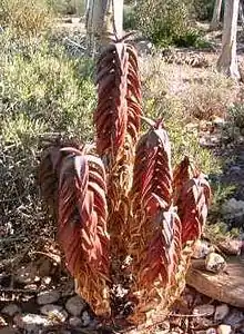 Pearson's aloe flowers in summer, and especially in January–February, producing a multi-branched inflorescence covered in bright red or yellow flowers.[5]