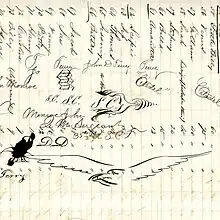 On Thursday, March 10, 1853, at 11 a.m., White held an auction at the cobblestoned plaza on the north side of the Charleston Customs House.[15] The product, which had been delivered to Charleston from the Lowcountry on Monday, March 7 by the steamship Col. Myers, was "a very prime gang of NINETY-SIX NEGROS who have been accustomed to the culture of Rice on the Combahee River, until within the last five years they cultivated Sea Island Cotton. These Negros are very orderly and well disciplined and have been long organised and worked as a gang. Among them are Carpenters and a Cooper. They will be offered in families with the exception of a few who are single."[15] Conditions of the sale were "one-third cash. Balance two and three years with interest from date of sale payable annually secured by bonds, mortgage of property sold, and approved personal security."[16] British artist Eyre Crowe, on tour through the United States with the writer William Thackeray, sketched the outdoor auction in between assisting with Thackeray's three-lecture series at the Hibernian Hall.[17] In a history published 1937, historian Frederic Bancroft described the Charleston scene in contrast with the images of a slave sale Crowe had sketched in Virginia:[18]