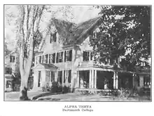 Alpha Theta was one of the first collegiate fraternities in the United States to break from its national organization over civil rights issues, and the first at the Greek-dominated Dartmouth College. In 1951, while Dickey served as president of the college, the student body passed a resolution calling on all fraternities to eliminate racial discrimination from their constitutions. The Theta Chi national organization's constitution contained a clause limiting membership in fraternity to "Caucasians" only. On April 24, 1952, the members of the Dartmouth chapter voted unanimously to stop recognizing the racial clause in Theta Chi's constitution.[3] Upon learning that the Dartmouth delegation to Theta Chi's national convention later that year planned to raise questions about the clause, the Alpha Theta chapter was derecognized by the national organization on July 25, 1952.[4] The house reincorporated as a local fraternity and adopted the name Alpha Theta.