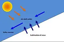 Due to wind, fresh snow does not stay at the surface but is blown into the first few meters of the surface layer. This blowing snow usually sublimates due to the insulation and has a significant meteorological effect . The sublimation of blowing snow leads to a modification of the energy budget and an overall temperature decrease of 0.5 °C combined to an increase of water vapor has been observed.[9] This forms a stable cold and moist layer of air above the snow surface, even if the surrounding air temperature is above freezing point. This cold layer induces downslope winds, which damper the growth of the PBL. This surface winds are also drifting the snowpack, leading to an increase of surface roughness and therefore an increase of wind shear (Forced convection).