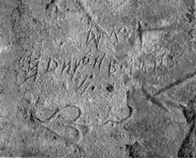 According to Vékony, the inscription was made by a Khavar leader, whose religion was Karaite.[12] The first symbol of the first row is a ligature, its transcription: atlïɣ.[13] The first symbol (from left) in the second row is a Khazarian word separator.[14]