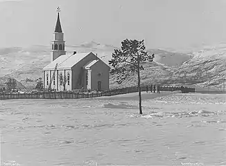 The first church built in Alta was the present building which was completed in 1858. The building was consecrated by the Bishop Knud Gislesen. The church was heavily damaged by the retreating German army in 1944 near the end of World War II. The church benches were burned, the windows were broken, and the electrical system was ruined. After the war, the church was renovated and restored in 1946-1948. The work was led by architect Kirsten Sjøgren-Erichsen. In 1968, electric heating was installed in the church. This church was the main church for the municipality until 2013 when the Northern Lights Cathedral was built as the new main church for the municipality and deanery.[3][4]