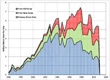 US production of primary aluminum peaked in 1980 at 4.64 million metric tons. Since then, US primary aluminum production has fallen by more than half, but secondary production has increased, making up much of the difference. In the 1950s and 1960s, primary production made up about 80% of the aluminum output. In 2014, primary production made up 32%, while secondary from new scrap made up 36% and secondary from old scrap made up 32% of US aluminum production.[1]