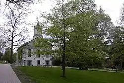 Alumni Hall, also known as Chapel Hall, is a historic multipurpose building located on the campus of Alfred University at Alfred in Allegany County, New York. It is a large frame structure built in 1851–1852 with what has been described as Alfred's most important Greek Revival features.[2] The three-story, 52-foot-wide (16 m) by 102-foot-long (31 m) rectangular structure has a red terra cotta roof. Designed and built by Maxson Stillman, it features a one of a kind 12 foot pine weathervane in the shape of a quill pen.[2] It was the fourth structure built for the Alfred Academy and housed a chapel, auditorium and lecture, recitation, library and lyceum rooms for college and community use.[3] It is now used primarily to house the Admissions Department.