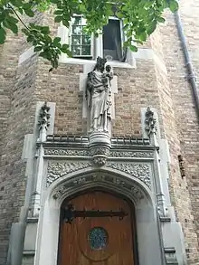 The hall's chapel is dedicated to St. Charles Borromeo, the patron saint of then-president Fr. Charles L. O'Donnell, CSC, and it features statues richly decorated neo-gothic interior with side altars with statues of Mary and St. Thomas Aquinas.[45][46][47] The altars were installed in March 1932, and were made in and imported from Italy through the work of John F. O'Hara, then prefect of religion.[47] The altars are made of Carrara marble and designed in gothic style of the rest of the building.[47] It is the site of numerous religious events, including Latin Mass and a commemoration of the Armenian Genocide.[48][49][50][51]