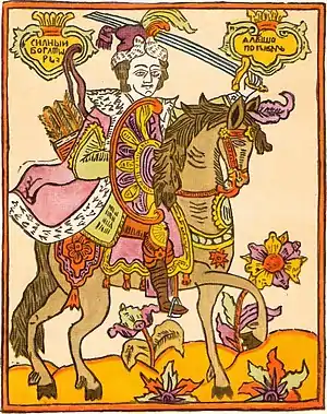 His tongue-lashings are attested by his mockery of Tugarin's gluttony[3][4] and insult to the unfaithful Princess.[5] His clever ruse was his disguise as a deaf pilgrim to make Tugarin approach him without caution.[6][7] He then plays a practical joke by donning Tugarin's multicolored robe,[lower-alpha 1] [6][7] tricking his squire into thinking it was Tugarin approaching Kiev as the victor.