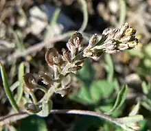 Alyssum desertorum is a species of flowering plant in the family Brassicaceae known by the common name desert madwort. It is native to Europe, North Africa and Asia, and it is found in parts of western North America as an introduced species and sometimes a weed.[2] This is a hairy annual herb producing upright stems up to about 20 centimeters tall. The leaves are linear to oblanceolate-linear in shape, 0.5-4 millimeters long and 0.3-3 millimeters wide.[2] The entire plant is covered by 8-20 rayed stellate trichomes, giving the plant a grayish appearance.[3] It produces small yellowish flowers with petals that are 2-2.5 millimeters long and round, notched fruits 2.5-4.5 millimeters long.[4] The brown seeds are winged, arranged two to a locule, and are about 1.5 millimeters long.[5]