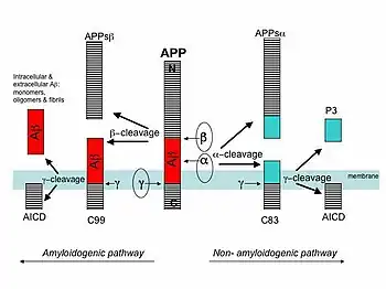 Neuritic plaques and neurofibrillary Tangles (NFTs) are the main pathological component of AD.[7][17] Neuritic plaques are composed mainly of the peptide Aβ, but also include other components.[18] APP is processed through either of two pathways, the first is termed the amyloidogenic pathway and produces Aβ.[18] The second pathway is the non-amyloidogenic pathway and does not produce Aβ.[18] In the amyloidogenic pathway, APP (the parent protein) is trafficked to endosomes, cleaved by beta-secretase (BACE), after which it moves back to the cell surface to be cleaved by gamma secretase thus releasing the Aβ peptide.[7][8][17][18] This form of APP processing produces multiple Aβ peptides, of which Aβ40 and Aβ42 peptide are most abundantly produced produced.[7][19] APP can also be cleaved by alpha and gamma-secretase and undergo non-amyloidogenic processing.[17][19] NFTs form when the tau protein, which is involved in microtubule stability, is hyperphosphorylated, dissociates from microtubules and then aggregates with other p-tau monomers forming tau oligomers, fibrils and eventually NFTs.[7] These types of pathologies do not differ across ethnic groups.[7]