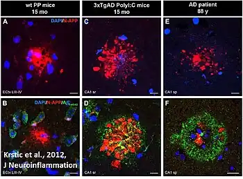 Neuroinflammation is another pathological component of AD pathology, and is associated with an increase in levels of inflammatory markers.[7][20] Researchers have also identified many genes linked to immune function that are risk factors for AD, such as TREM2.[20] TREM2 are highly expressed in microglia, the immune cell of the brain, tying the progression of AD with dysfunction in microglial activity.[21] Neuroinflammation, Aβ and tau pathologies interact in Alzheimer's disease, and their progress can be monitored with biomarkers.[20] For example, studies have found the neuroinflammatory marker YKL-40 in the cerebrospinal fluid (CSF) of AD patients.[16][4] This protein increases years before the onset of AD symptoms and correlates with other neurodegenerative biomarkers, which suggests a potential to predict disease progression.[4] While YKL-40 has not been shown to associate with the APOE -ε4 allele, there is research to link this biomarker to AD in the Hispanic population.[4]