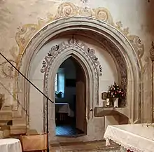 The east wall of the church bears a large colourful medieval fresco showing a scene of the Resurrection. It was discovered during the 1958 restoration.