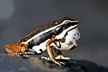 A. munduruku is a medium-sized frog for its genus, with a snout–vent length of 24.87–27.33 mm (0.979–1.076 in) for adult males and 20.42–28.59 mm (0.804–1.126 in) for adult females. The back is mostly black, with a cream stripe along the edge of the upperside and over the eye, from snout to the groin. Another cream stripe runs from the tip of the snout along the lower lips to the forelimbs. The undersides of the body and limbs are white, with worm-like black markings, and the chin is white with black spots. The upperside of the limbs are brown with some black markings on the hands. Two orange spots are present, one on the armpit and another hidden one on the lower leg and an orange stripe runs from the groin to the upperside of the thigh. The iris is metallic grey. Both sexes look broadly similar, but can be distinguished by the presence of vocal slits in males. When preserved in 70% ethanol, the orange markings on the underside and the cream stripe on the upperside are duller in colour and the iris is grey. The skin of the upperside is mostly granulated, except on the head and forelimbs; the skin of the underside is smooth. The hands and feet lack webbing, and there are no protrusions on the tarsus.[2]